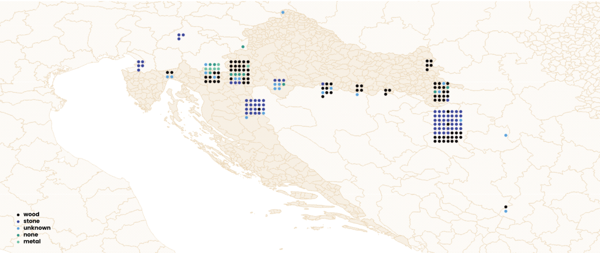 It is not only the form and symbols, but also the material of grave markers that can indicate the attitude toward the deceased by those who buried them. In most local traditions, the social prestige, wealth, or power of individuals tends to be associated with the material qualities used for their graves—their size, type of material, and aesthetic qualities—indicating the value and durability of social remembrance. In sepulchral traditions that favor durable materials such as stone or various hard metals (bronze, iron, etc.), the predominance of wooden grave markers clearly signals temporariness and ephemerality. Wooden markers decay over time, and the graves they once marked become unmarked and forgotten. The map clearly shows how, in some contexts like Bosnia and Herzegovina, more durable materials dominate, while in others, such as Croatia, they are entirely absent. Additionally, planted flowers or artificial bouquets, placed by local residents can also serve as less ephemeral markers of memory, signaling affection, and care.