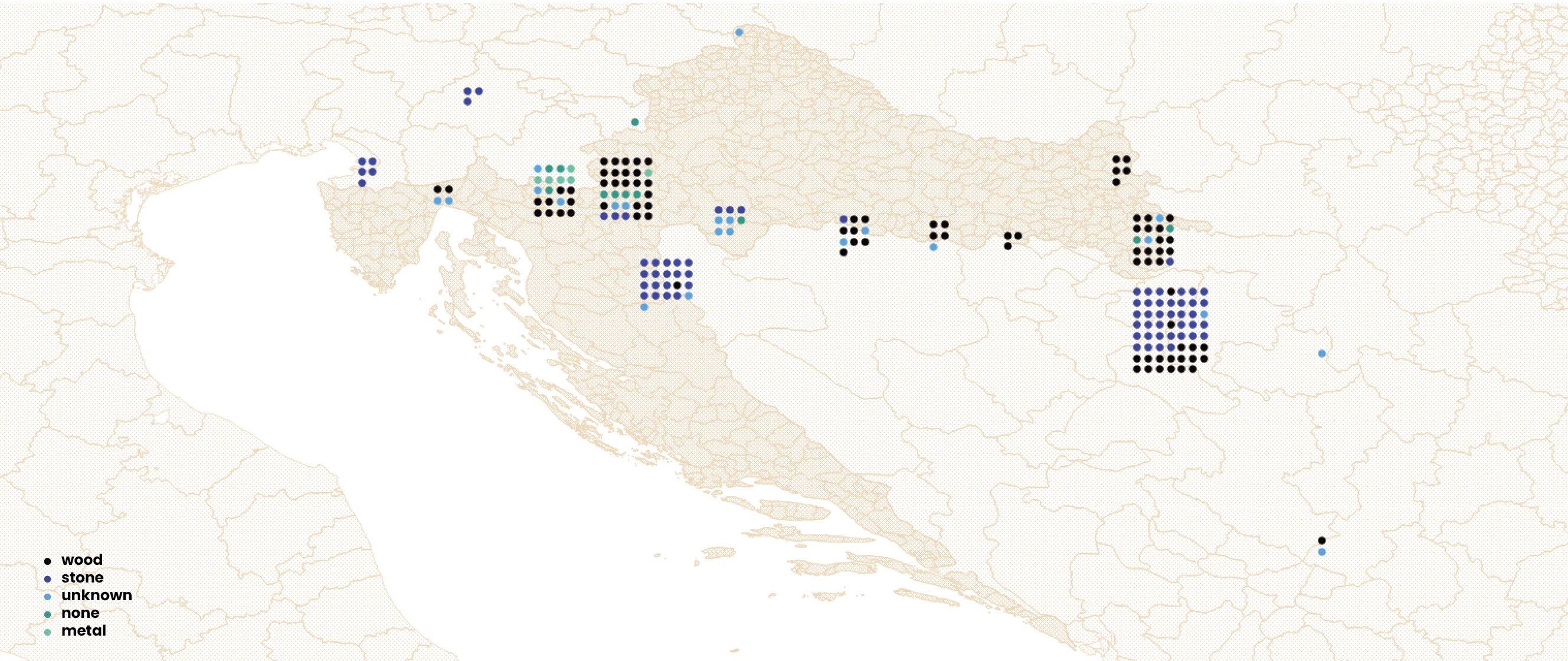 Odnos prema pokojnicima razabire se, osim iz oblika i simbolike nadgrobnih obilježja, i iz korištenih materijala. Društveni prestiž, bogatstvo ili moć pojedinaca u većini se lokalnih tradicijskih konteksta dovodi u vezu s materijalnim svojstvima grobova—veličinom, vrstom materijala i estetskim kvalitetama kojima se upućuje na vrijednost i trajnost društvenog pamćenja. U sepulkralnim tradicijama koje favoriziraju trajne materijale poput kamena ili raznih tvrdih metala (bronca, željeza i sl.), prevlast drvenih grobnih obilježja jasno signalizira privremenost i prolaznost. Drvena obilježja s vremenom propadaju, a grobovi koje su nekad označavala postaju neoznačeni i zaboravljeni. Karta pokazuje kako u nekim kontekstima, poput Bosne i Hercegovine, dominiraju trajniji materijali, dok su u drugima, poput Hrvatske, potpuno odsutni. Dodatno, posađeno ili umjetno cvijeće kojim mještani ponekad ukrašavaju ove grobove također može poslužiti kao manje prolazno obilježje sjećanja, signal empatije i brige.