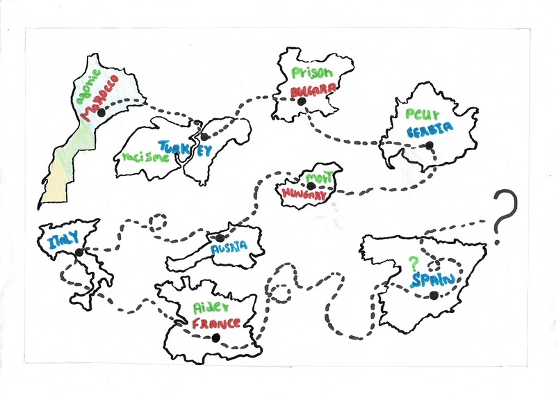 Ono što ih je fizički i psihički pogodilo tijekom putovanja Balkanom primjećuje se bez obzira na prolazak vremena i na razdaljinu, kao što je slučaj kod onih koji kasnije stignu do francusko-talijanske granice o čemu svjedoči rad organizacije Liječnici svijeta (Médecins du monde) u Briançonu. U karti niže, koja je nastala u skloništu udruge Terrasses Solidaires u Briançonu 2023. godine, Marouane je svoje iskustvo balkanske rute rekonstruirao dovodeći u vezu emociju ili ključnu riječ sa svakom od zemalja koju je prešao: agonija [agonie] za Maroko, rasizam [racisme] za Tursku, strah [peur] za Srbiju i smrt [mort] za Mađarsku. Općenito, kada ljudi pobjegnu s Balkana, retrospektivni prikaz tog putovanja poprima oblik pravog “putovanja smrti” (Courtois 2023).