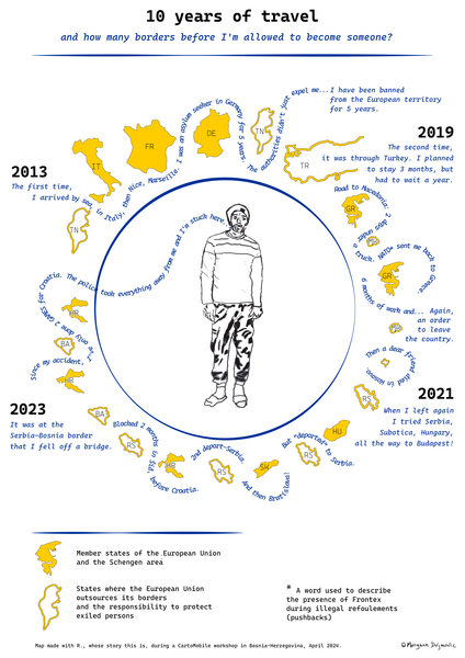 Na proljeće 2024. godine dovezla sam CartoMobile u blizinu kampova Lipa i Borići. U njemu sam primila nekoliko ljudi a svi su bili pogođeni postupnim institucionalnim nasiljem tijekom njihovog putovanja prema Europi. Kartografski pothvat u kojeg sam se upustila zajedno s R*-om ilustrira njegovo putovanje od Tunisa do Bosne i Hercegovine, pokušava ga ocrtati kroz njegove oči, i približiti se osjetljivoj dimenziji njegovog iskustva. Narativna karta koja je proizašla iz tog pothvata nosi naziv iz njegovog kazivanja: „Deset godina putovanja, i koliko granica prije nego što imam pravo postati netko?“