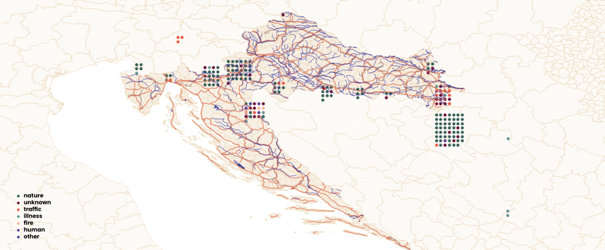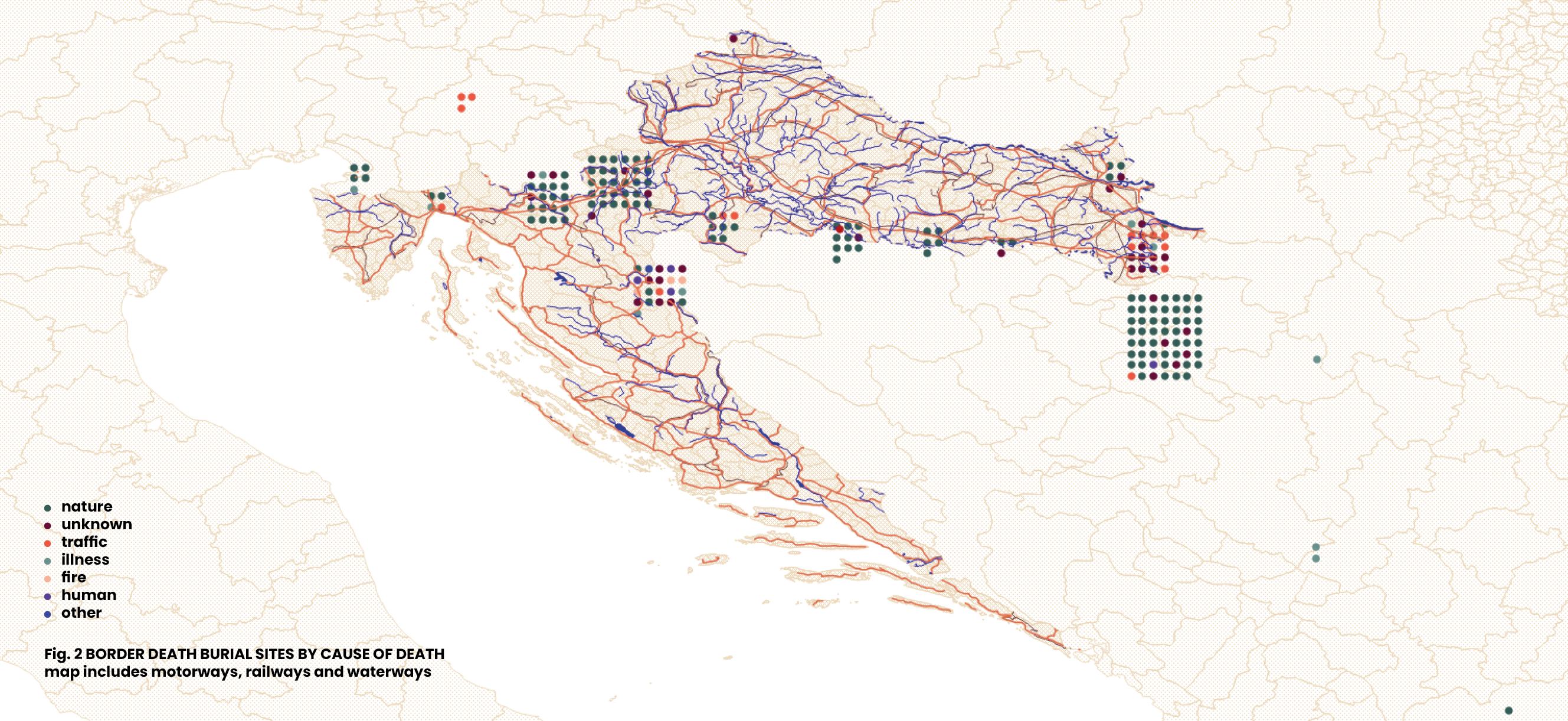 Čak i kada je uzrok smrti ljudsko djelovanje, rijetko se ono dovodi u vezu s djelovanjem države i predstavnika vlasti. Češće se radi o samoubojstvu ili smrti koju je prouzročio drugi migrant, mještanin, krijumčar i slično. Ova karta ocrtava geografije grobova umrlih na granicama oblikovane iz perspektive uzroka smrti. Pokazuje da su grobovi poginulih u prometnim nesrećama koncentrirani duž kopnene granice između Hrvatske i Srbije poznate kao Koridor X – jednog od najvažnijih paneuropskih prometnih pravaca koji povezuje Srednju Europu s jugoistočnim dijelom kontinenta i dalje se proteže prema Bliskom istoku i Aziji. Na karti prevladavaju smrti koje su posljedica djelovanja prirodnih sila, što je dijelom povezano s time da je upravo na takav način stradalo najviše osoba, ali i s činjenicom da su svi neidentificirani preminuli – od kojih su se mnogi utopili – pokopani u zemlji tranzita.